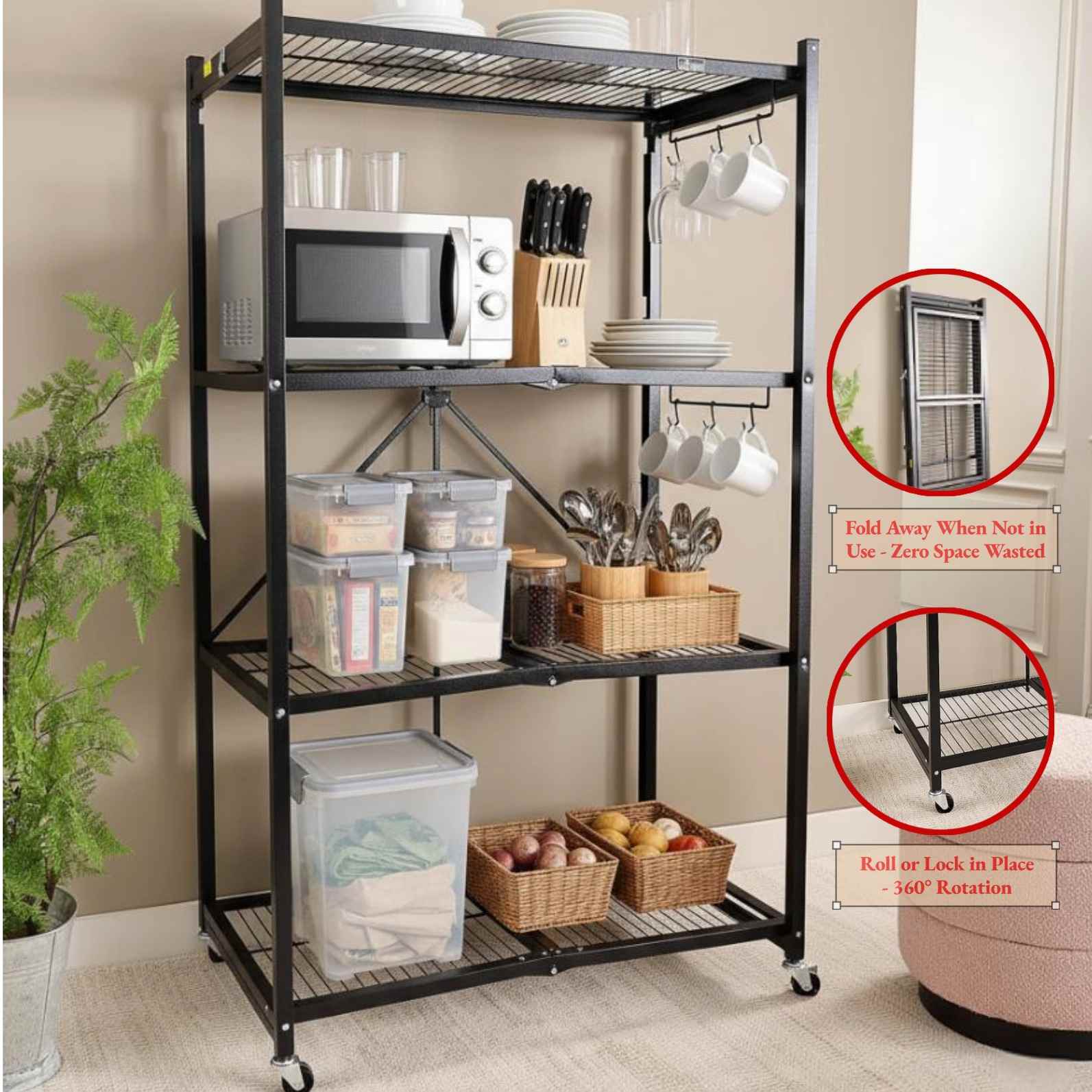 The four-tier design stores plenty of stuff and folds flat to free up space when not in use.Unfold When Needed, Fold Away to Save Space.